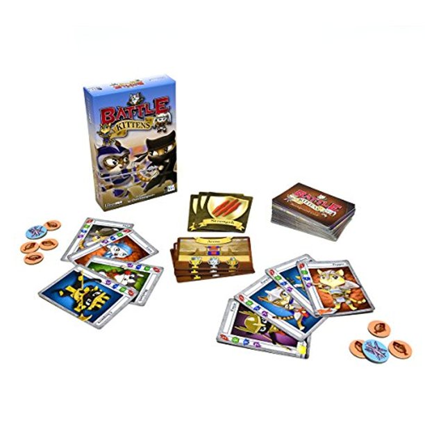 - Contents include 54 Kitten Cards, 9 Battleground Cards, 4 Attribute Cards, 7 King Cards, 6 Reference Cards, 50 -1pt Fish Counters, 15 -5pt Fish Counters, 1 Rulebook